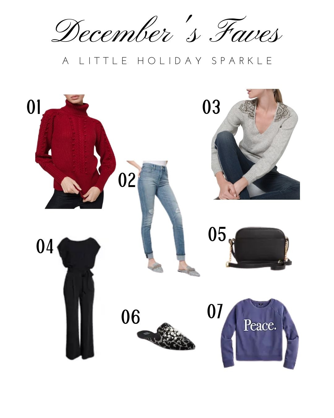 1 Red Turtleneck Sweater 2 Distressed Denim 3 Embellished V-neck Sweater 4 Cap Sleeve Jumpsuit 5 Tory Burch Camera Bag 6 Embellished Leopard Mule 7 Peace Crew Neck Sweatshirt